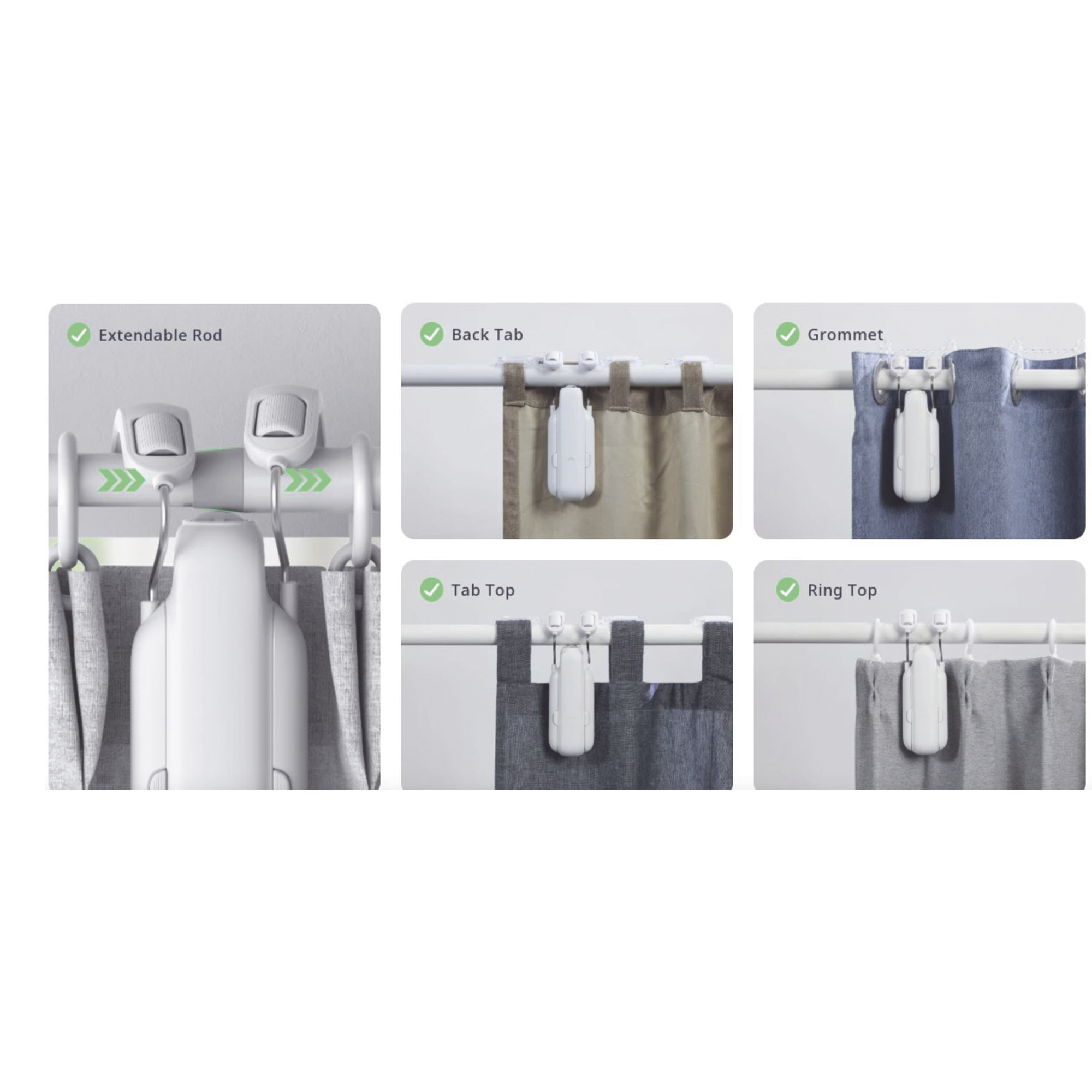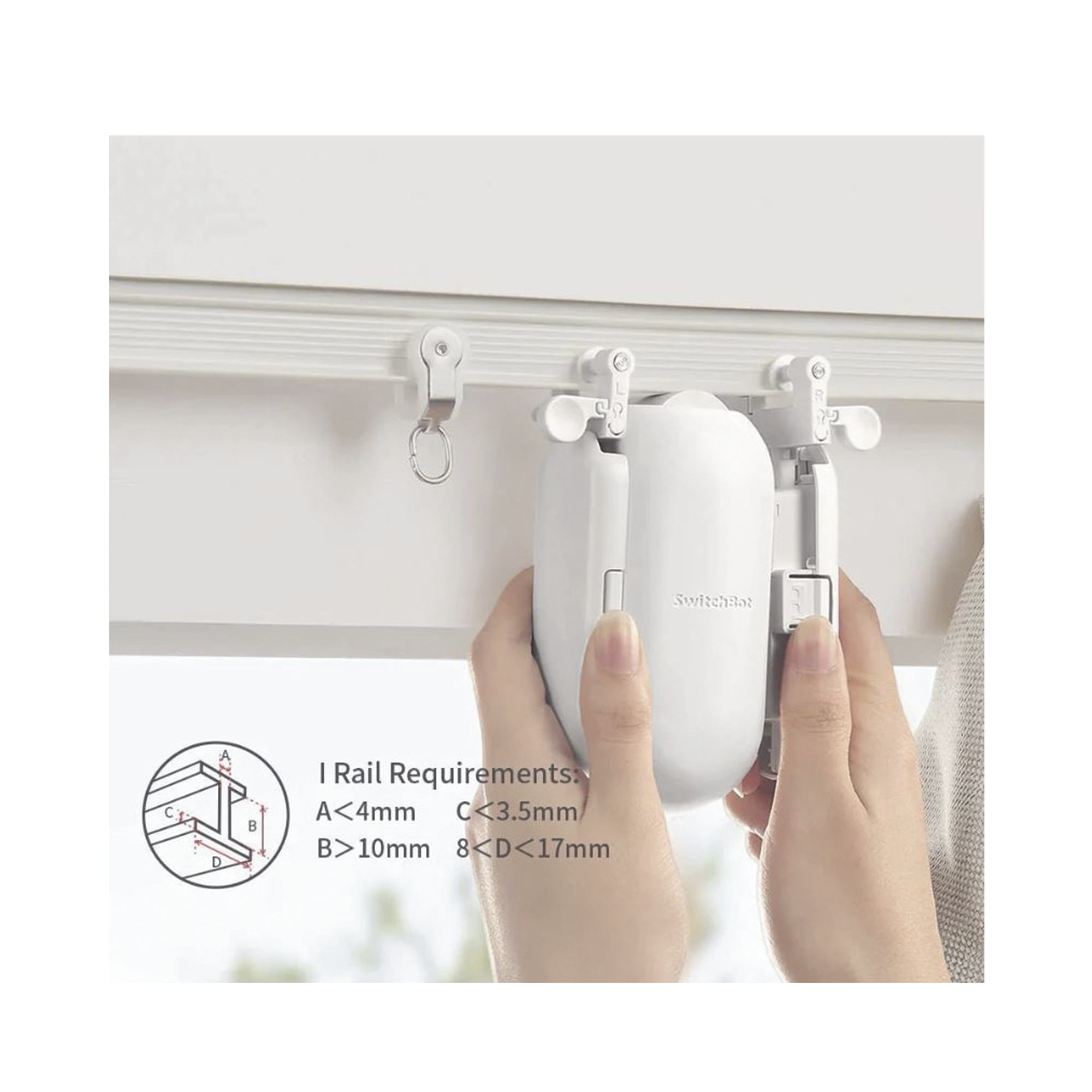 SwitchBot Curtain se puede conectar a una amplia gama de cortinas para ayudarlas a hacerlas inteligentes con una instalación simple de 30 segundos que no requiere herramientas. Después de la instalación, podrá abrir y cerrar sus cortinas automáticamente a través de nuestra aplicación o utilizando horarios para determinar cuándo se abrirán o cerrarán sus cortinas.